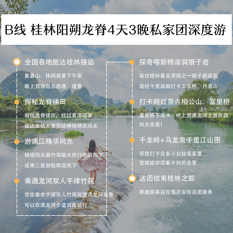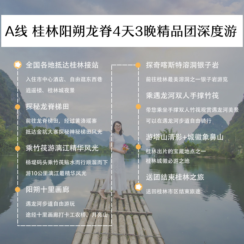本产品支持“1人可订”,特别适合商务人士或独自出差后顺道度假的旅客。无需等待拼团满员,随时下单即可开启桂林山水之旅。行程安排紧凑高效,四天三晚覆盖桂林市区与阳朔核心景点,兼顾工作与休闲,让差旅后的放松无缝衔接,省时又省心。
