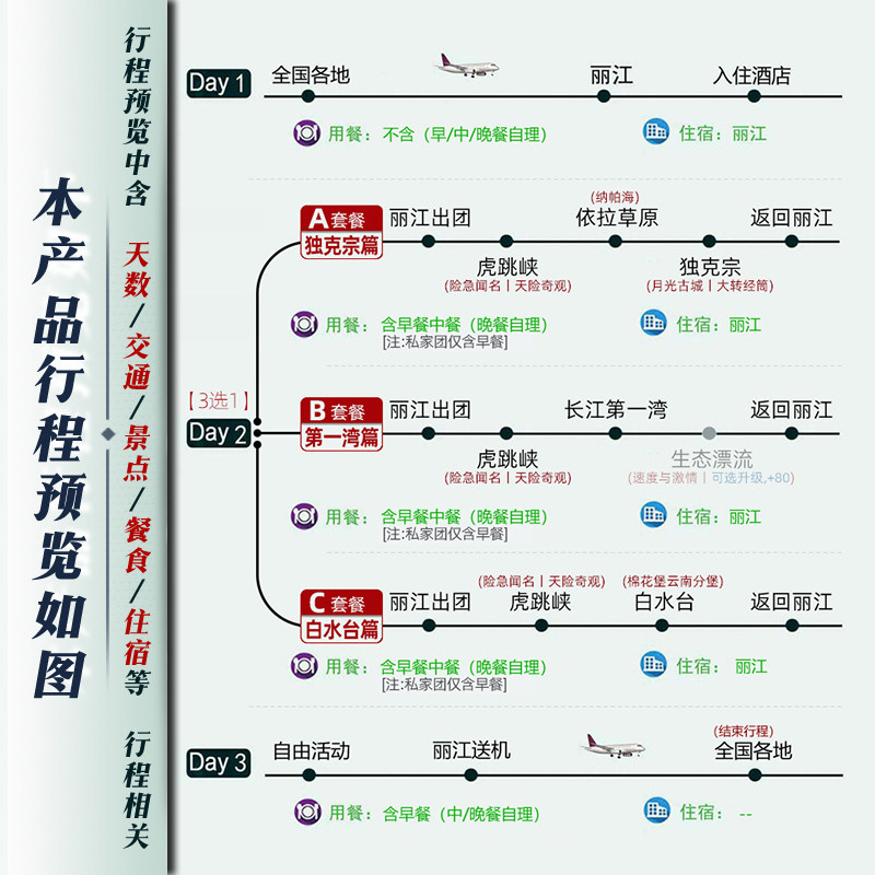 专为时间有限的差旅人群设计,3天2晚高效串联丽江与香格里拉两大目的地。行程紧凑但不仓促,涵盖古城、雪山、草原、藏文化等核心景观,避免冗长交通与无效等待,最大化利用碎片化假期,在短假期内实现身心双重放松。