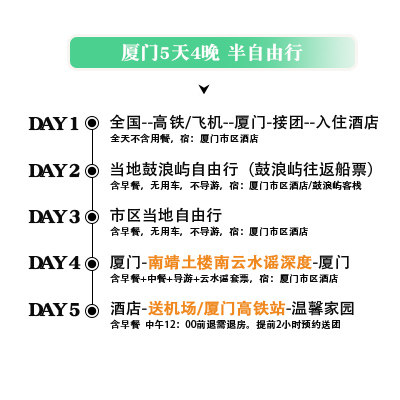 本行程专为商务差旅人士及独自出行者设计,支持1人预订,无需拼团等待,极大提升出行灵活性。从厦门出发,涵盖鼓浪屿、南靖云水谣土楼等核心景点,行程安排张弛有度,既满足高效观光需求,又保留充足自由时间处理工作或放松身心,是兼顾效率与体验的理想差旅度假选择。