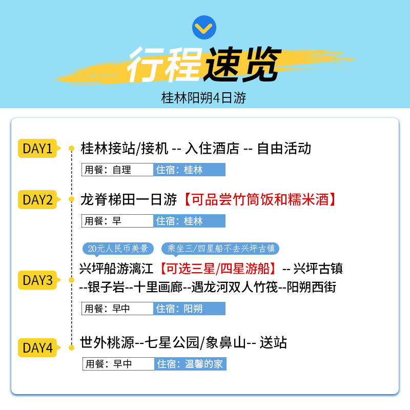 专为商务差旅人士设计的桂林4天3晚小团行程,仅限9人成团,确保行程灵活高效。一价全含省去琐碎比价与额外支出,适合在短假期或出差间隙轻松切换至度假模式。团队规模小,沟通协调便捷,不影响返程工作安排,真正实现“差旅+休闲”无缝衔接。