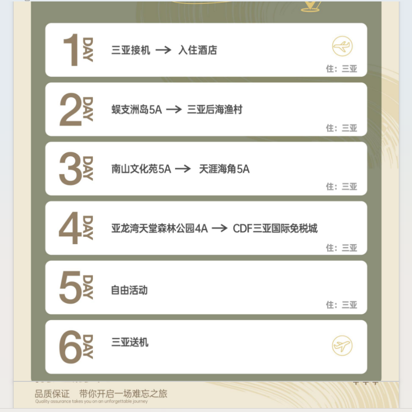 专为独自出差或临时起意度假的商务人士设计,支持1人即可成行,无需拼凑同伴。12人精品小团确保服务品质与私密性,避免大型团队的嘈杂与等待。行程节奏张弛有度,既保留自由活动时间处理紧急工作,又安排蜈支洲岛赶海、黄金海岸漫步等特色体验,满足差旅人群对高效、舒适与独特体验的多重需求。