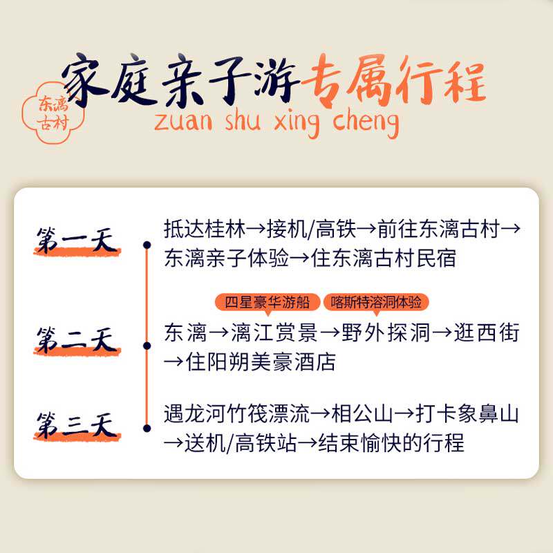 产品明确标注‘2人可订’,打破传统团队游人数限制,特别适合携家人同行的差旅人士。行程融入坐竹筏、探洞、游古镇等亲子互动项目,孩子可在东漓古村民俗体验中学习非遗文化,在漓江游船上辨识象鼻山等自然奇观。所有活动均经过安全适龄设计,家长无需额外规划即可享受高质量陪伴时光,让商务出行延伸为温馨家庭记忆。