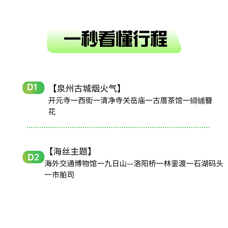 行程精心设计,将开元寺、洛阳桥、九日山、西街及周边古村古镇高效串联,避免重复路线与交通浪费。对于时间宝贵的差旅人士而言,两天内即可领略泉州作为‘海上丝绸之路’起点的历史底蕴,兼顾效率与深度,最大化利用有限假期。