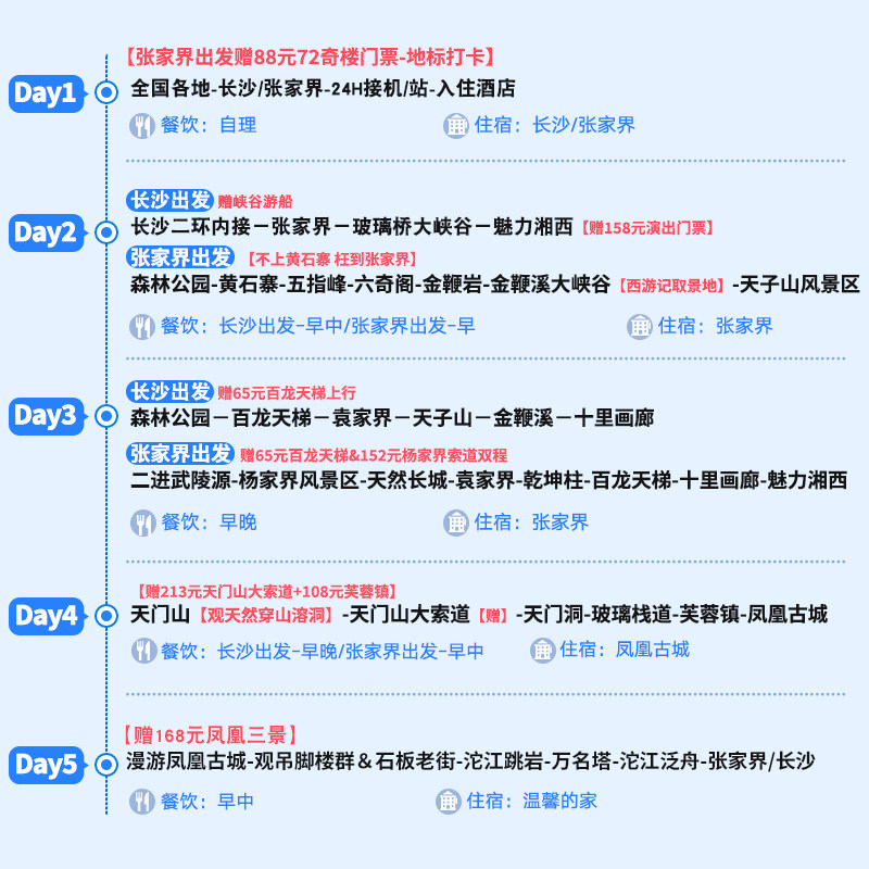 行程包含乘坐世界最高户外电梯百龙天梯及大索道登顶天门山,配合沱江乘船游览凤凰古城,多种交通方式结合,既节省体力又提升观景效率。差旅人士无需耗费时间徒步,即可全方位领略喀斯特地貌奇观与水乡古镇韵味。