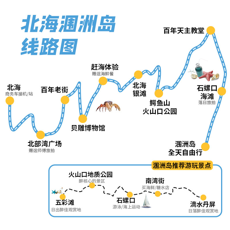 本行程支持1人独立预订,无需拼团等待,特别适合商务人士或独自出差后顺道度假的旅客。北海涠洲岛4天3晚小团游采用8人纯玩精品小团模式,确保行程高效、服务贴心。无论是临时差旅结束后的放松,还是短假期的快速切换,都能无缝衔接,节省时间成本,提升差旅体验的舒适度与自由度。