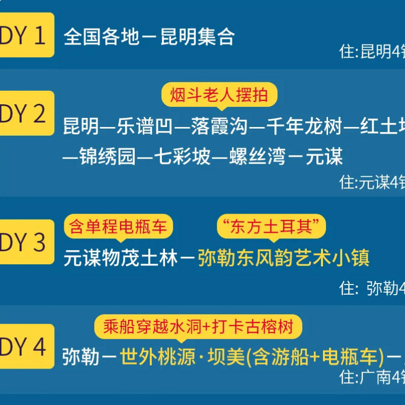 本产品打破传统观光模式,以‘世界遗产巡礼+人文旅行+自然奇观’为主题,将梯田、溶洞、红土地、土林、古镇、湖泊等云南东南部代表性元素有机融合。差旅人士可在一次行程中体验摄影、徒步、换装、地质探秘等多重玩法,无需多次规划,高效达成‘一站式’深度度假目标。