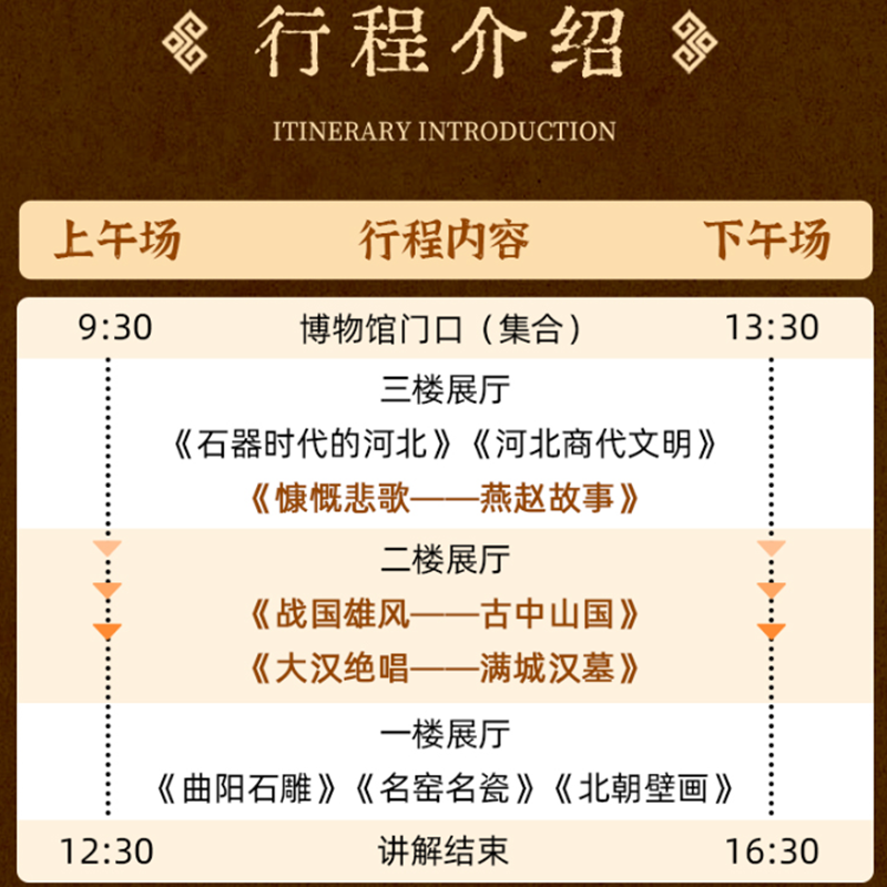 打破传统差旅的枯燥节奏,融入深度人文旅行元素。本产品以“燕赵文化”为主题,聚焦河北博物院核心展陈,通过专业讲解将文物、历史与地域精神串联起来。无论是独自出差还是携家带口,都能在有限时间内获得高浓度的文化输入,让您的石家庄之行不止于会议与酒店。