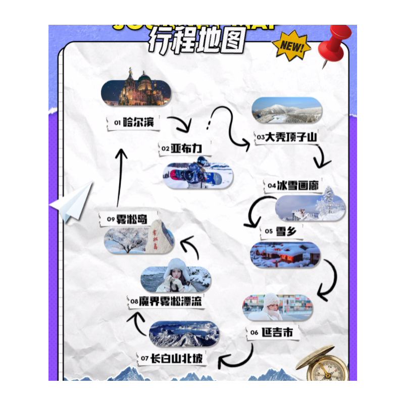行程以哈尔滨为起点和终点,串联吉林、牡丹江、延边等核心目的地,形成高效闭环路线,避免重复折返。对时间宝贵的差旅人士而言,这种设计最大化利用有限假期,确保在7天内深度游览长白山、雪乡、延吉等多元景观,实现‘一次出行,多重收获’。