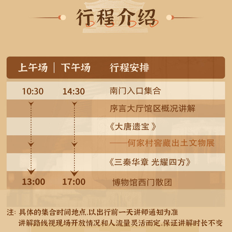 行程精心规划,重点覆盖唐代壁画珍品馆与历代陶俑展两大亮点展区,避免无效游览。2.5小时的时长恰到好处,既保证内容深度,又不占用过多差旅时间,让您在短暂驻留中高效获取最具代表性的历史文化信息。