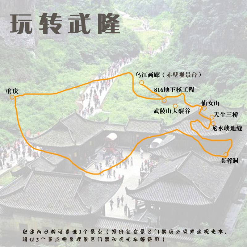 两日行程精心串联武隆世界自然遗产三大精华——天生三桥、龙水峡地缝与芙蓉洞,配合观光车与索道接驳,大幅节省体力与时间。对时间紧张的差旅人群而言,可在最短时间内领略喀斯特地貌奇观,实现工作与自然疗愈的完美平衡。