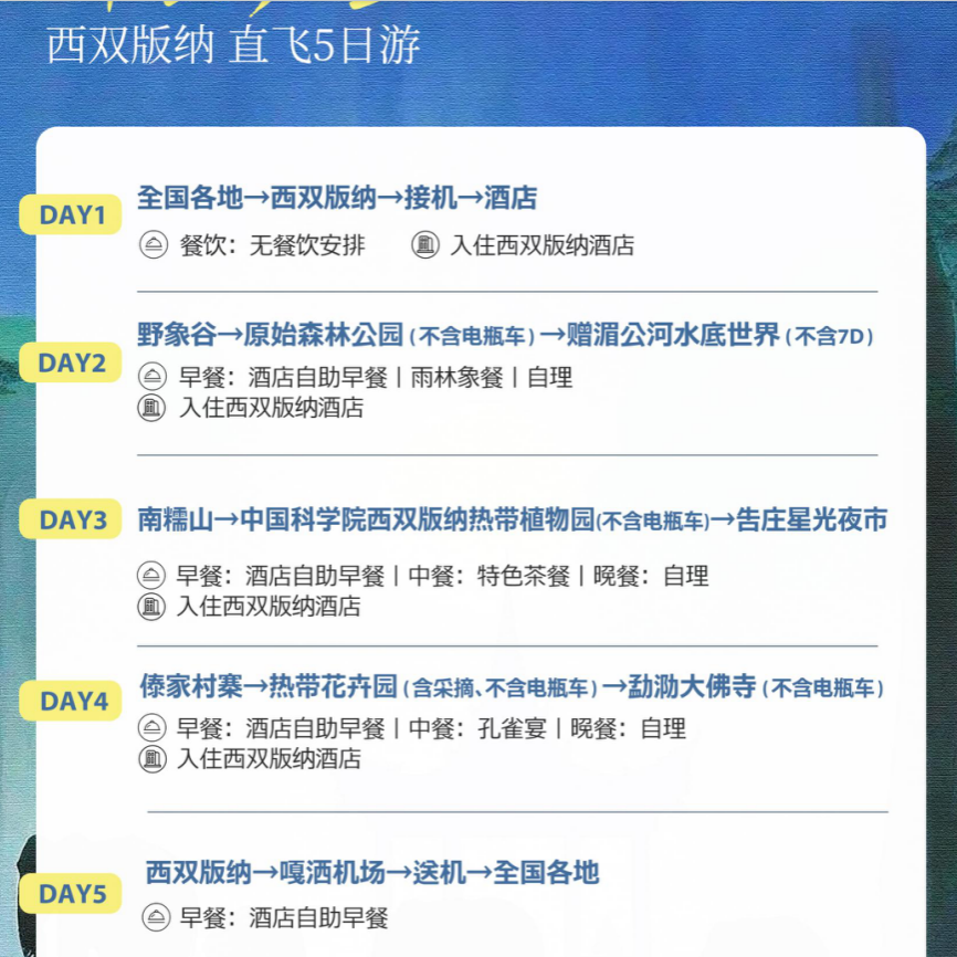 本线路支持从北京、上海、广州、深圳、成都等28个主要城市出发,覆盖全国核心商务枢纽,无论您身处哪个差旅热点城市,均可便捷安排往返行程。含机票一站式服务,省去中转烦恼,让商务出行后的休闲时光无缝衔接。尤其适合结束紧张会议或项目后,携家人即刻开启热带雨林亲子假期,高效利用碎片化时间,兼顾工作与家庭陪伴。