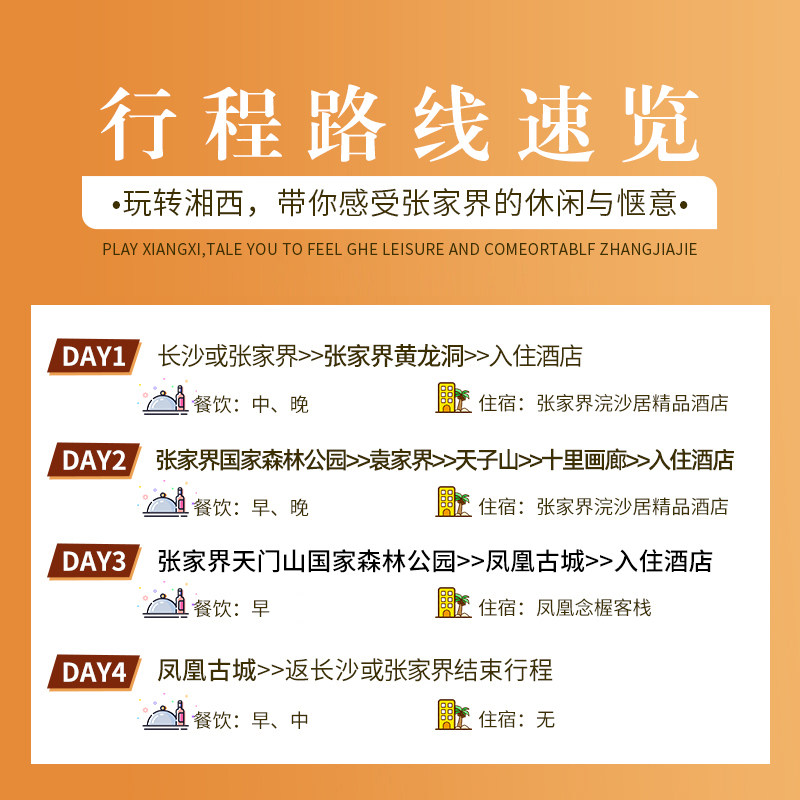 深知差旅人士时间宝贵,本产品承诺纯玩无购物店停留,杜绝隐形消费与无效等待。每日行程张弛有度,既保证核心景点深度游览(如天门山索道、凤凰古城自由探索),又预留休整空间,避免过度疲劳。让您的短假真正用于放松与探索,而非被动消费。