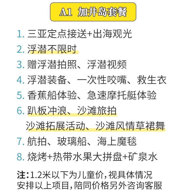 本线路支持单人预订,无需拼团等待,特别适合商务差旅人士在紧凑日程中灵活插入休闲体验。从三亚出发前往万宁加井岛,全程包船服务,省去协调多人时间的麻烦,让差旅中的放松变得高效而便捷。无论是会议间隙还是项目结束后的犒赏,都能即订即走,轻松享受碧海蓝天的治愈时光。