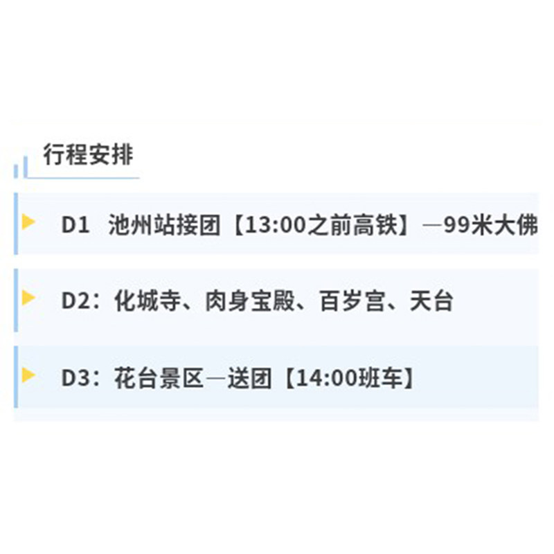 本行程专为差旅人士设计,提供池州高铁站专人接站服务,免除您拖着行李辗转交通的烦恼。从抵达池州那一刻起,专业导游将全程陪同,确保您高效、顺畅地进入度假状态。无论是商务出差后的放松,还是结合工作安排的短途旅行,此服务都能让您快速切换角色,轻松融入九华山的禅意氛围,真正实现‘说走就走’的差旅度假体验。