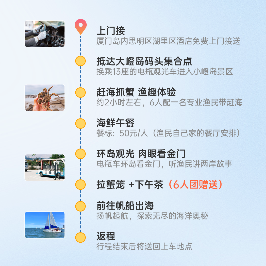 针对独自出差或临时起意放松的商务旅客,本行程支持1人即可成行,无需凑团或调整日程。无论您是结束会议后的傍晚,还是周末空档,都能快速预订并参与小嶝岛赶海活动。这种高度灵活的安排极大提升了差旅期间的休闲自由度,让您在高效工作之余,也能即刻拥抱大海的惬意与乐趣。
