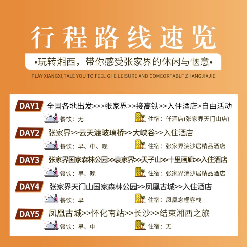 专为时间宝贵的差旅人群定制,5天4晚全程无购物、无隐形消费,所有时间聚焦于张家界核心景区:森林公园、天门山、凤凰古城等。行程节奏张弛有度,既保证游览完整性,又避免过度疲劳,让短暂假期发挥最大效益。