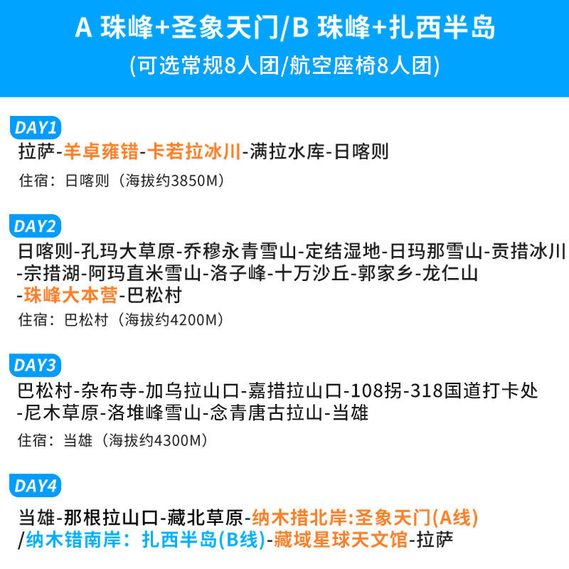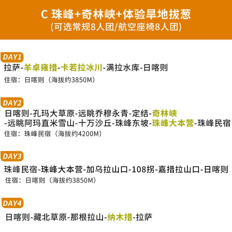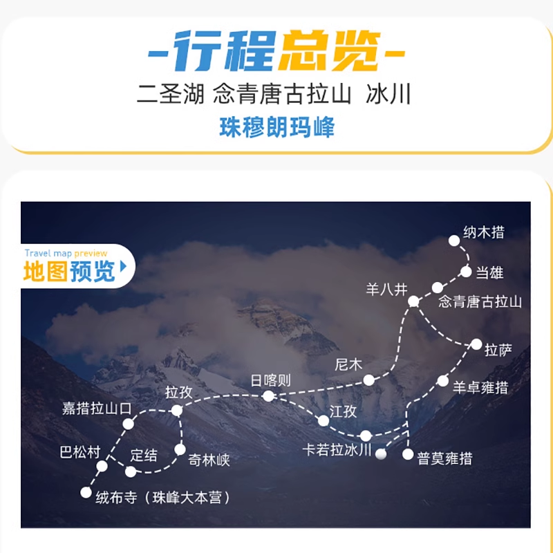 精心设计的4天3晚行程,从拉萨出发,覆盖羊卓雍措、奇林峡、珠峰大本营等核心景点,节奏张弛有度,既满足深度体验又避免过度疲劳。特别适合利用周末+年假组合出行的差旅人士,在有限时间内高效打卡西藏标志性景观,周一即可精神饱满返岗,实现“短假长游”的理想差旅模式。
