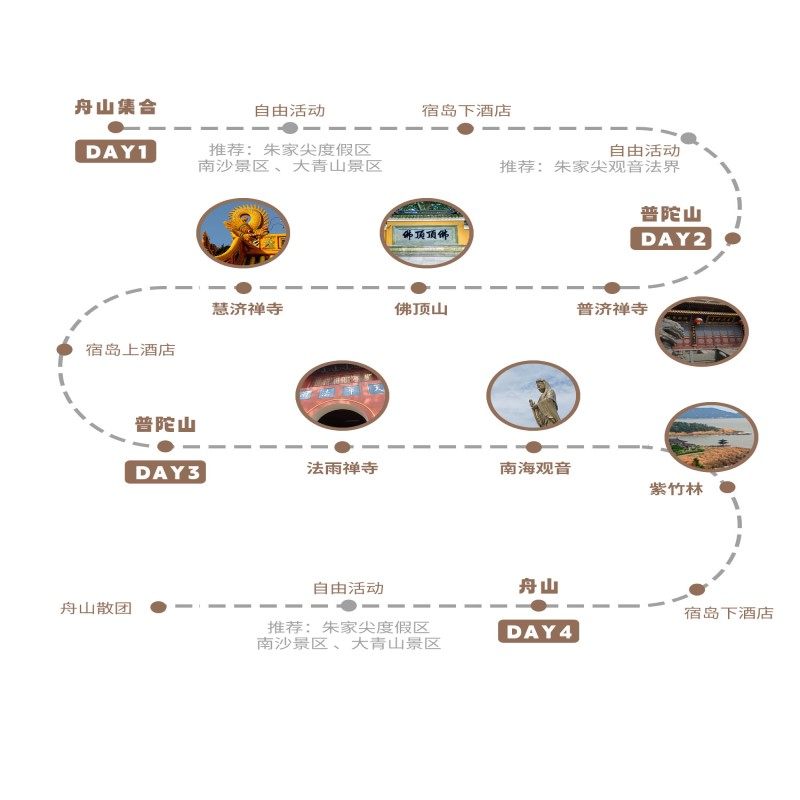 4天3晚的紧凑安排完美适配短期出差窗口期——前两日专注普陀山核心景点,后两日自由掌控节奏。无论是延长会议后的缓冲期,还是周末延伸小长假,该行程都能以合理成本提供超值体验,最大化利用有限假期,提升差旅幸福感。