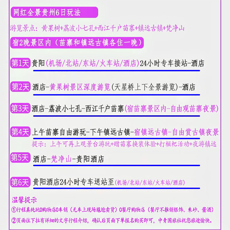 差旅无忧:贵阳出发,6天5晚纯玩0购物行程