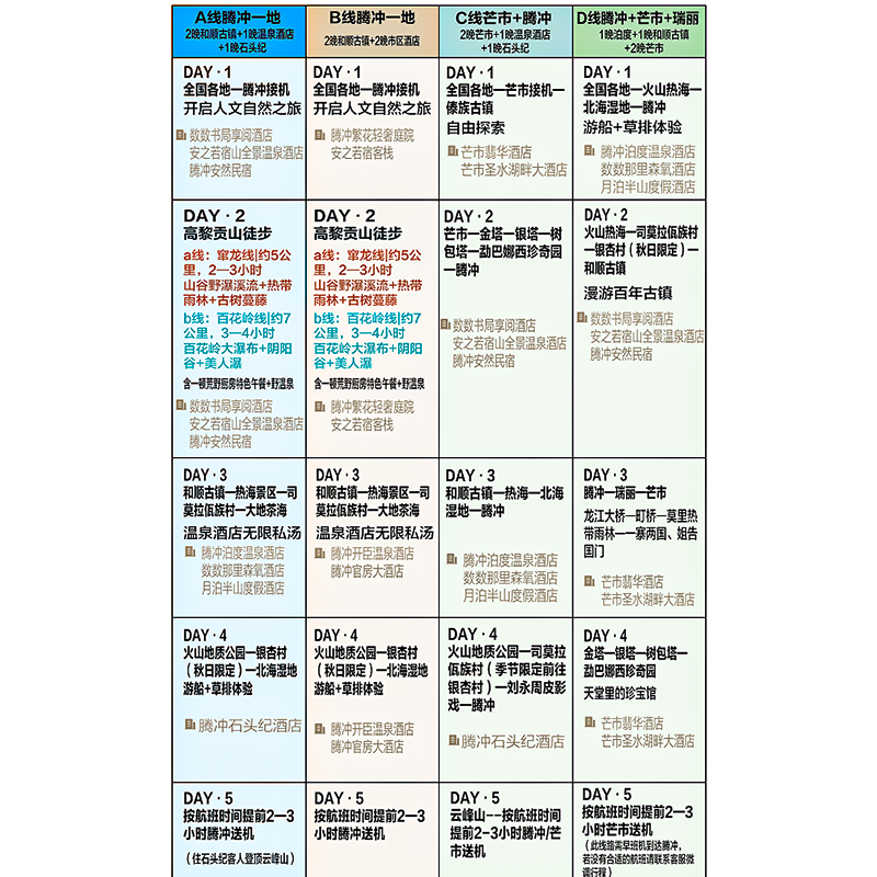 精心规划腾冲、芒市、瑞丽5天4晚一地多点主题线路,避免重复往返,最大化利用差旅时间。从火山热海到边境风情,从温泉疗愈到民族手工艺,主题鲜明、节奏合理,让出差间隙的短途度假也能收获丰富体验,提升整体出行价值感。