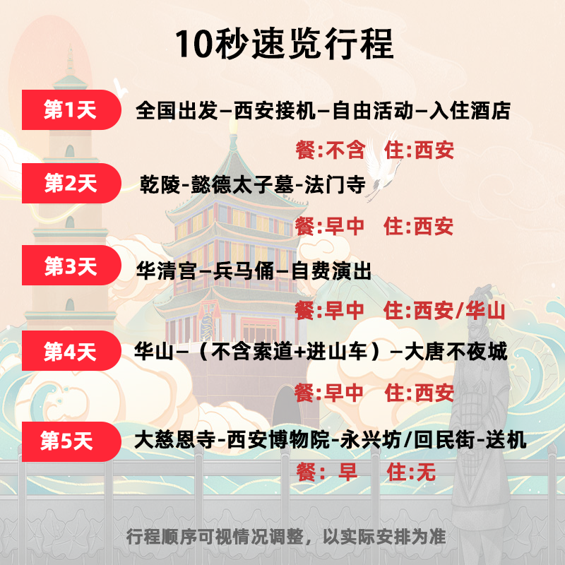专为时间宝贵的差旅人士定制,5天4晚行程覆盖西安、华山、兵马俑、咸阳等核心目的地,路线环线设计避免重复折返,节省交通耗时。每日景点安排合理,既有充足游览时间,又不过度疲劳。无论是利用年假、调休还是长周末,都能高效完成一次高价值的文化度假,真正实现“短假长体验”。