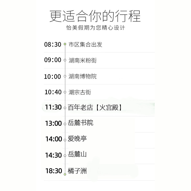 区别于普通观光团,本产品以‘湖湘文化深度游’与‘地道美食体验’为双核心主题,精心串联岳麓山、博物馆、文和友三大IP,形成逻辑清晰的游览动线。每个环节都经过时间测算与内容打磨,确保在一日之内完成有深度、有温度、有味道的差旅微度假,告别浮光掠影式的打卡式旅游。