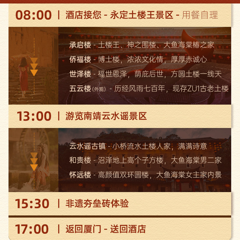 本产品承诺全程纯玩,无任何强制购物环节,确保每一分钟都用于真实体验。对时间宝贵的差旅人群而言,这意味着行程高效、节奏可控,无需应对推销干扰,真正把有限的假期用在刀刃上,专注享受土楼建筑之美与古镇慢生活。