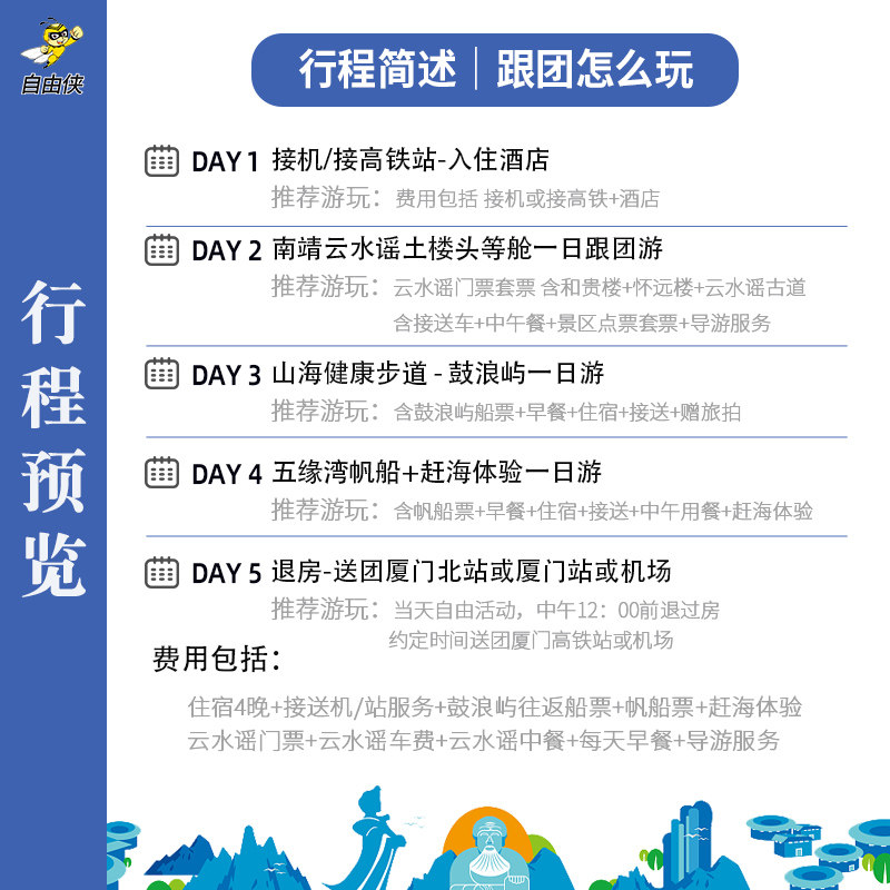 本行程专为兼顾差旅与度假需求的旅客设计,从厦门出发,无缝衔接漳州南靖土楼与云水谣古镇,既满足商务出行后的放松需求,又节省交通衔接时间。首日提供接机/接站服务,末日中午退房后送团,全程安排紧凑有序,适合出差结束后即刻开启短途深度游,实现工作与休闲的高效切换。