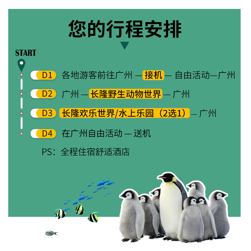 精心规划的4天3晚行程,时间安排科学合理,适合利用周末或短假期出行。第一天抵达即入住,第二天全天畅玩长隆动物世界,第三天体验欢乐世界与水上乐园,第四天悠闲返程。行程节奏张弛有度,既能满足孩子对游乐的期待,又不会过度消耗家长精力,是差旅人士兼顾家庭陪伴的理想选择。