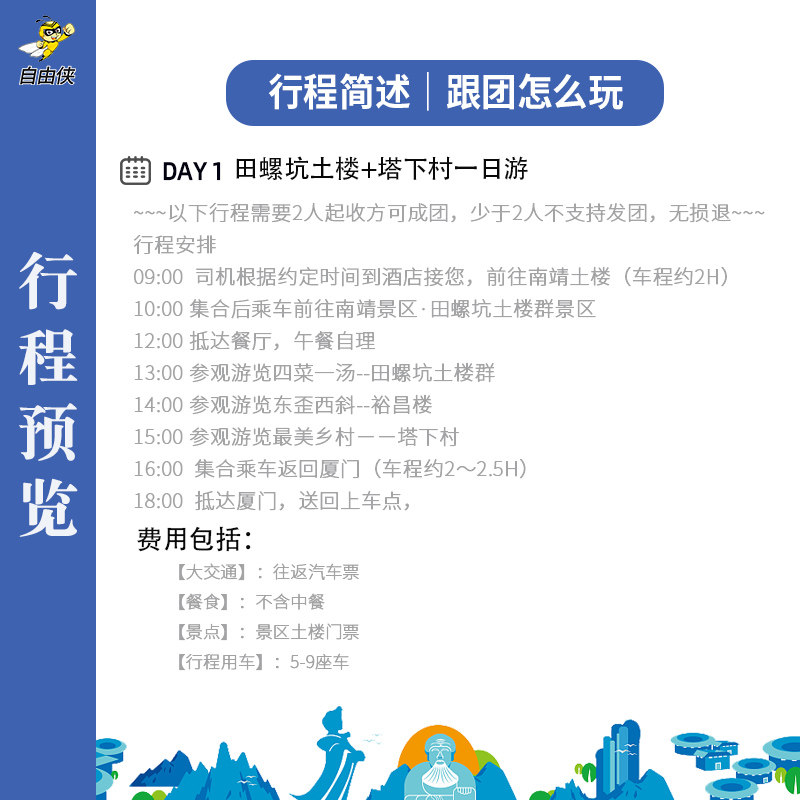 全程采用标准化时间表:09:00厦门接车,18:00准时送回,每一环节清晰标注。司机仅提供交通与基础讲解,无强制购物或额外收费项目,真正实现“纯玩”承诺。对时间敏感的商务人士而言,这种可预测、无干扰的行程安排极大提升差旅度假体验。