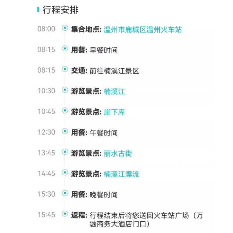 深知差旅人士时间宝贵,本产品包含特色午餐,免去自行觅食的耗时与不确定性。餐标兼顾本地风味与商务需求,环境整洁舒适。全程由专业导游协调交通与景点衔接,您只需专注体验。从温州市区出发,早出晚归,不占用额外住宿成本,却收获完整度假体验,是追求高性价比差旅休闲的明智之选。