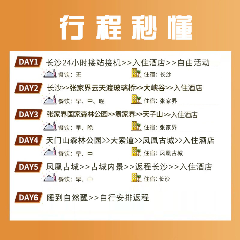 以长沙为起点,整合湖南西部最精华旅游资源,提供交通、住宿、门票、导览全包式服务。差旅人士无需自行研究路线、比价订票,一键解决所有出行琐事。尤其适合外地赴长沙开会后想就近度假的商务客,或需考察湘西市场的企业人员。6天时间高效覆盖自然、文化、冒险三大维度,实现‘一次出行,多重收获’的差旅增值体验。