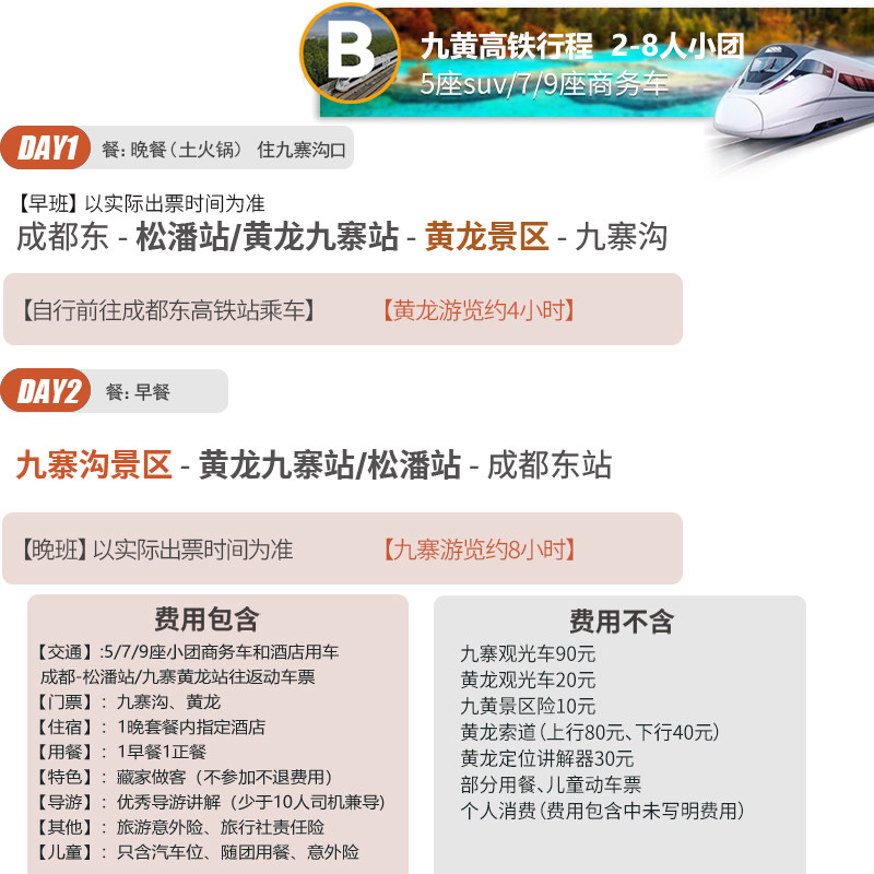 本线路专为商务差旅人士设计,从成都市区便捷搭乘动车或高铁前往阿坝州,大幅缩短交通耗时,避免长途颠簸。行程安排紧凑合理,2天1晚即可完成九寨沟与黄龙核心景点游览,适合利用周末或短假期实现高效度假。无需额外安排接送,团队统一协调交通,让差旅与休闲无缝衔接,提升出行效率与舒适度。