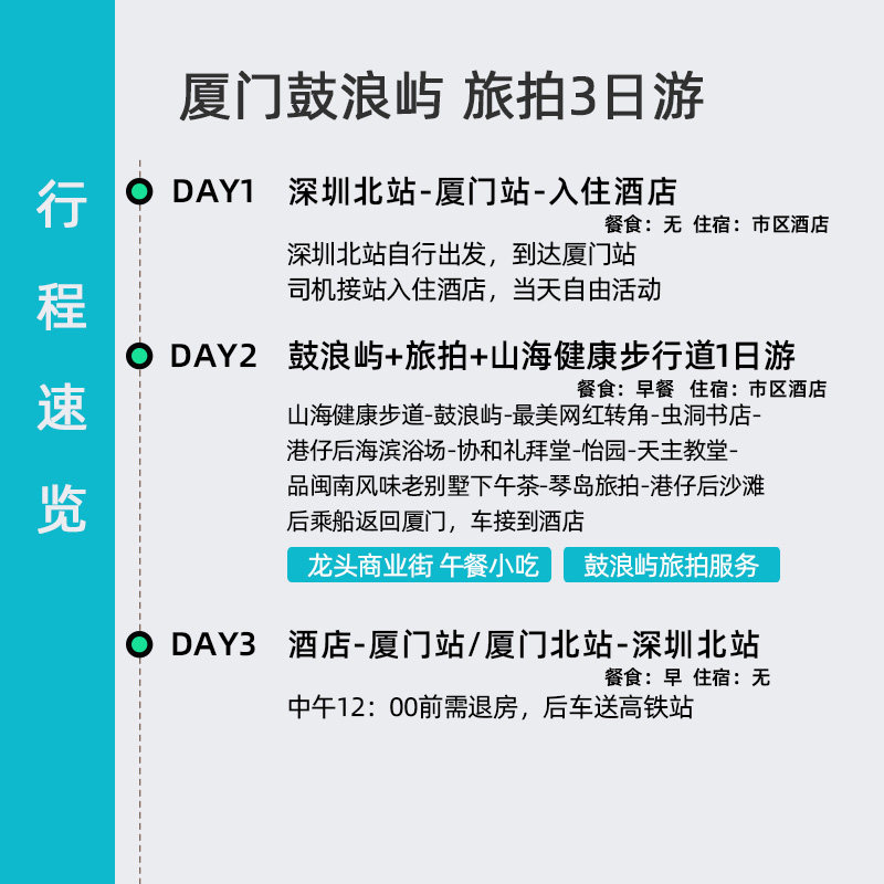 本行程专为商务差旅人士设计,从深圳北站乘坐高铁仅需3.5小时即可抵达厦门,无缝衔接工作与休闲。动车班次密集、准点率高,避免航班延误风险,让您的差旅安排更从容。抵达后即有专车接驳至酒店,无需繁琐换乘,最大化利用有限假期时间,轻松开启鼓浪屿人文之旅。