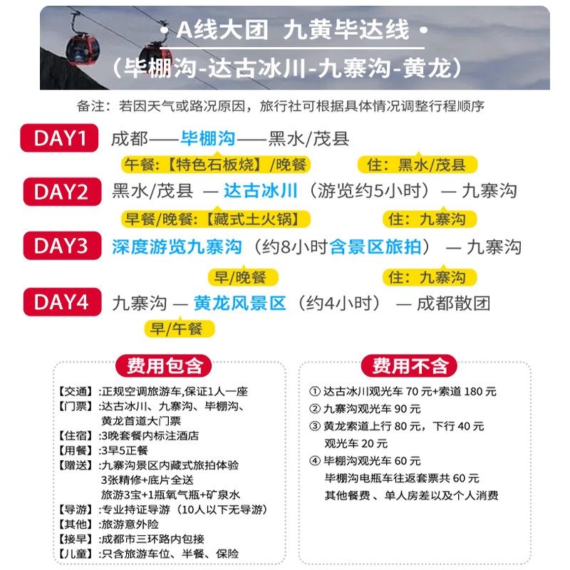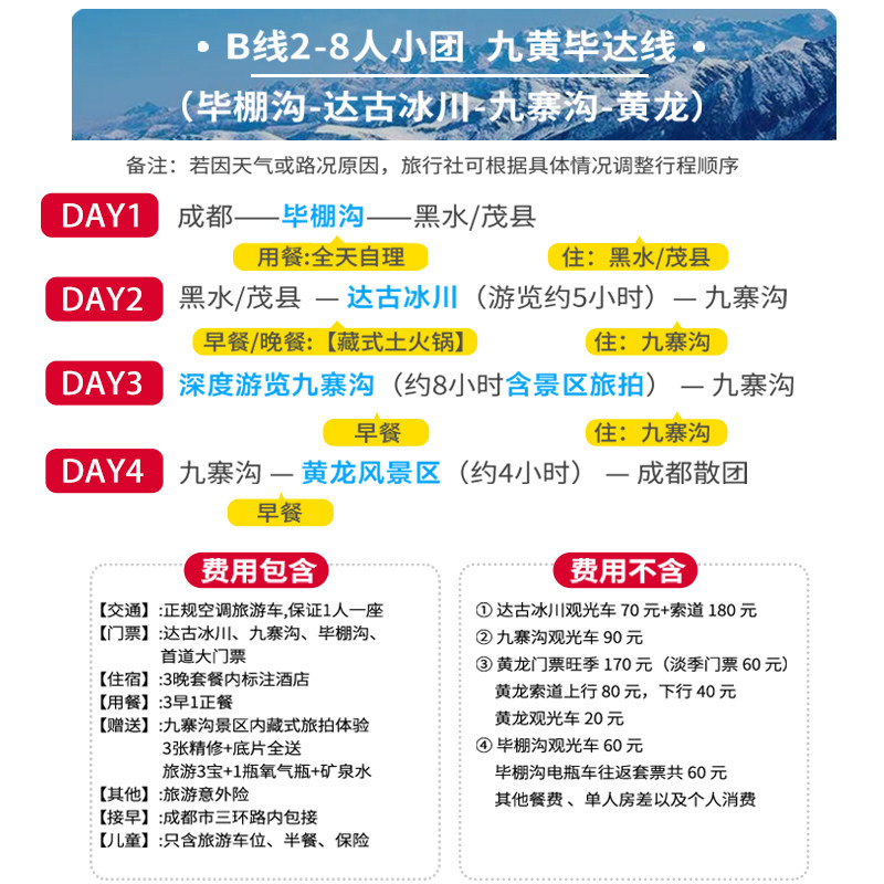 精心规划的4日3晚行程串联九寨沟、黄龙、都江堰、达古冰川、毕棚沟及四姑娘山六大核心景区,路线紧凑却不仓促,每日安排合理,避免无效奔波。特别适合利用周末或短假期出差顺带度假的职场人士,在短时间内高效打卡川西自然与人文精华,最大化差旅附加值。