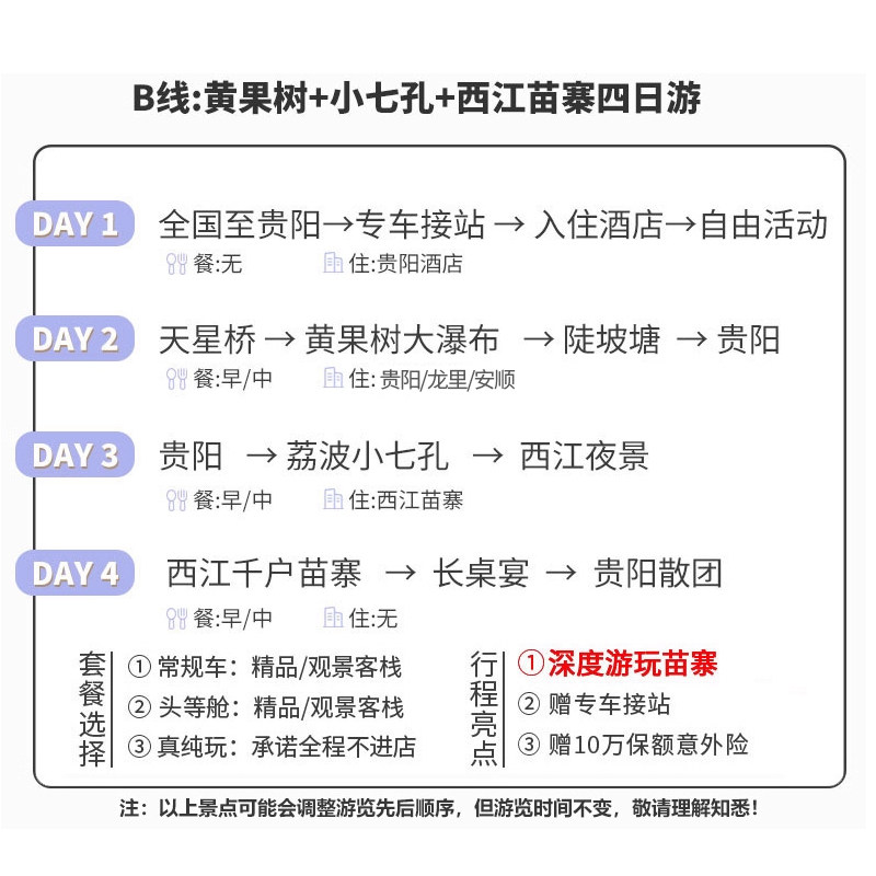 本线路专为差旅人士设计,支持1人单独预订,无需拼团等待,极大提升出行效率。从贵阳出发,4天3晚紧凑行程覆盖黄果树瀑布、西江千户苗寨、荔波小七孔、镇远古城及梵净山等贵州核心景点,兼顾商务与休闲需求。无论您是出差间隙短途放松,还是利用周末开启微度假,都能轻松成行,省去协调多人时间的烦恼,真正实现说走就走的差旅式度假体验。