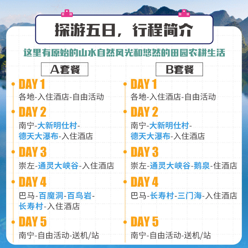 专为商务人士或独自出行旅客设计,本线路支持1人即可预订,无需拼团等待,极大提升差旅效率。从南宁出发,5天4晚行程覆盖德天瀑布、通灵峡谷、巴马长寿村等核心景点,行程紧凑但节奏舒适,兼顾工作与休闲需求。无论是出差间隙放松身心,还是利用周末开启短途度假,都能轻松实现无缝衔接,真正实现‘说走就走’的差旅新体验。