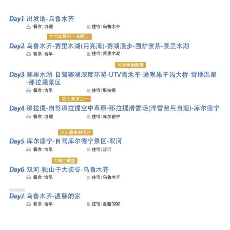 线路以乌鲁木齐为起点,高效串联伊犁、博尔塔拉、克拉玛依等新疆核心城市,7天6晚覆盖赛里木湖、那拉提、库尔德宁三大精华景区。对于需在多地处理公务的差旅者,可将工作与度假巧妙结合,避免重复往返,最大化利用出行时间,实现‘一程多用’的高效差旅模式。