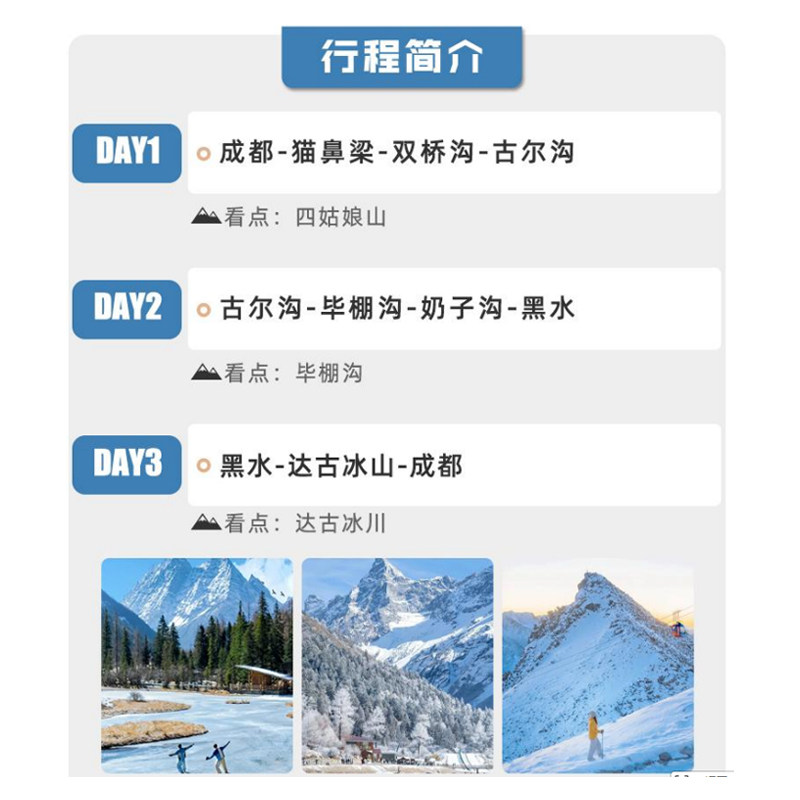 线路支持从成都和重庆两大西南枢纽城市出发,无论您是参加完商务会议还是完成项目洽谈,都能快速接入行程。高铁、航班密集,地面接驳顺畅,极大减少中转耗时。三天紧凑行程覆盖四姑娘山、墨石公园、鱼子西、毕棚沟、达古冰川等精华景点,让差旅间隙也能高效打卡川西秘境。