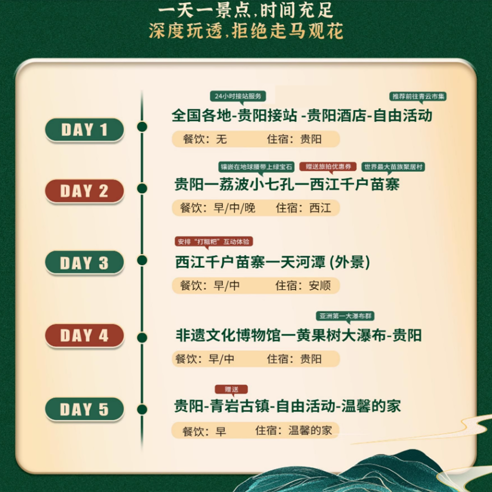 精心规划的5天4晚行程,完美适配年假、调休或周末+3天的小长假组合。从抵达贵阳起,每日安排2-3个核心景点,节奏张弛有度,避免走马观花。黄果树瀑布、荔波小七孔、西江千户苗寨三大IP全覆盖,兼顾自然奇观与民族风情。对于时间宝贵的差旅人群,此线路确保在最短时间内收获最丰富的体验,实现假期价值最大化。