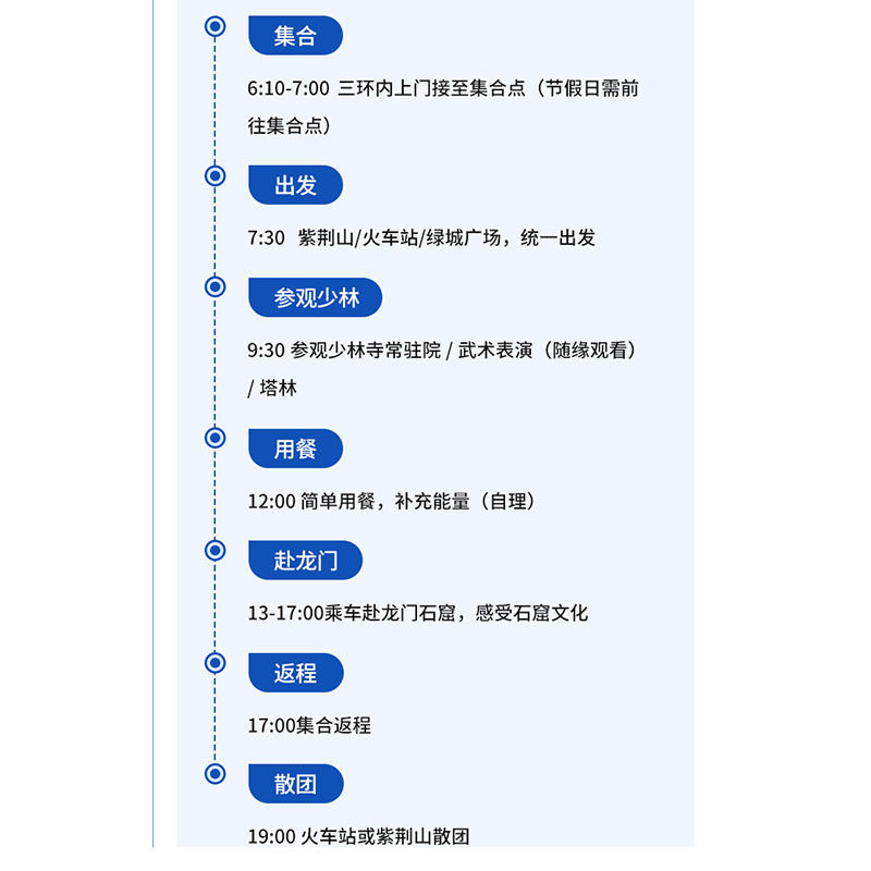 无论您的差旅目的地是郑州还是洛阳,均可便捷参团。线路设计充分考虑高铁、机场等交通枢纽接驳,提供定点集合与返程服务,避免绕路耗时。一日游节奏合理,早上出发、傍晚返回,不影响次日工作安排,真正实现‘工作+度假’两不误的差旅新方式。