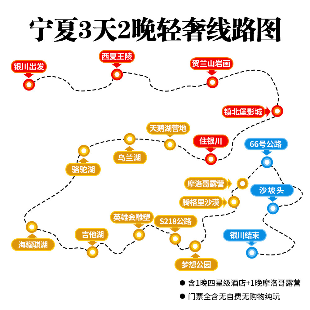 行程覆盖宁夏银川、中卫及内蒙古阿拉善三地,形成高效环线。从银川市区出发,经沙坡头(中卫)深入腾格里沙漠(阿拉善界),避免重复折返,最大化利用3天时间。交通接驳由专车负责,差旅者无需操心路线规划,下车即享体验,契合商务人士对时间精准把控的需求。