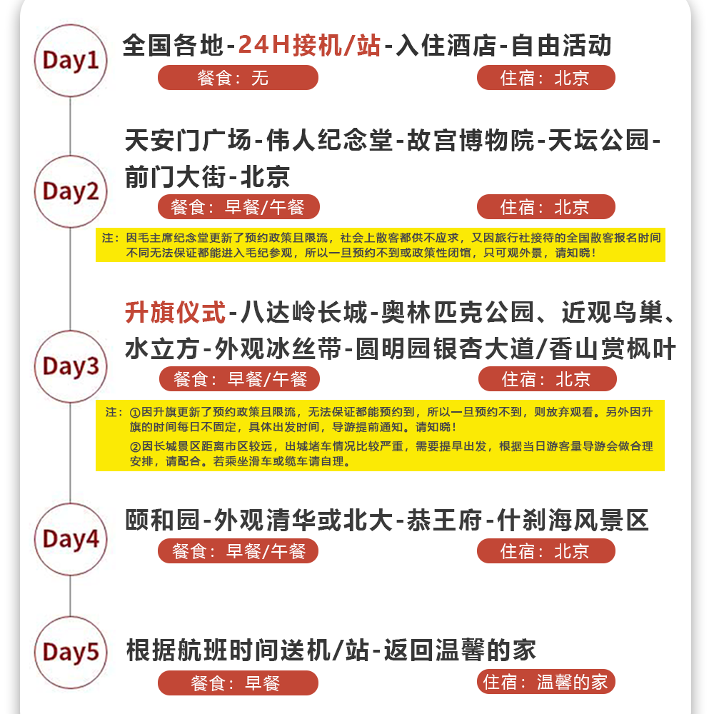 采用舒适巴士全程接送,串联各大景点,避免差旅人士在陌生城市打车、换乘的麻烦。尤其适合从武汉、长沙、厦门、福州等中远程城市前来、希望快速进入游览状态的旅客。专业导游随车讲解,车上即可了解北京历史脉络,下车即深度体验,让有限的5天假期发挥最大价值,兼顾休息与探索。