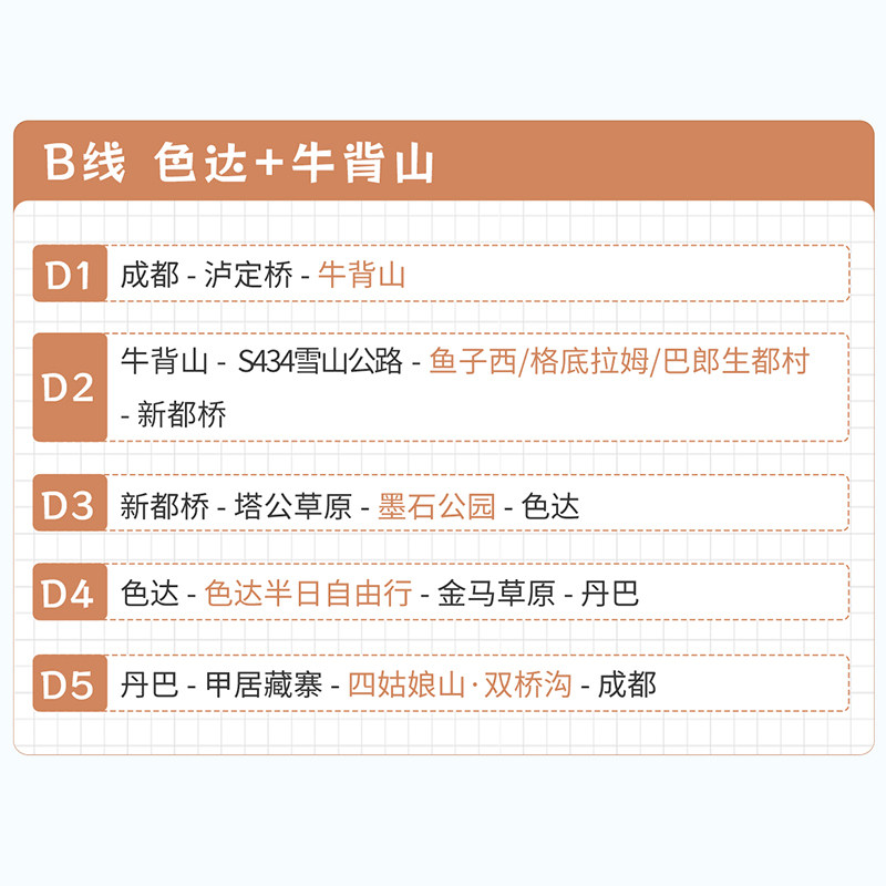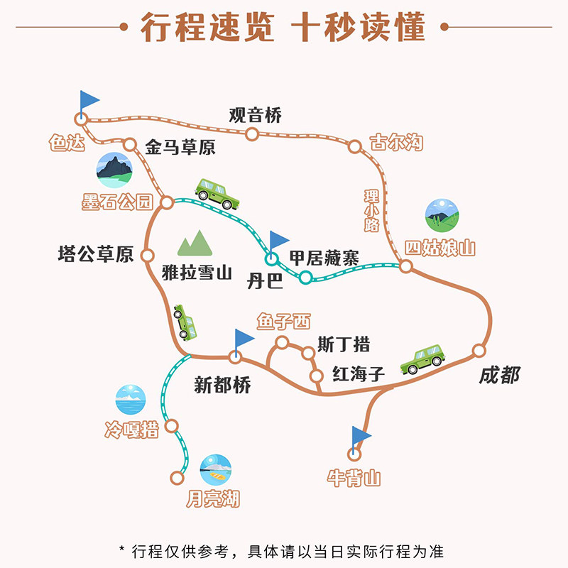 从成都市区直接出发,串联甘孜、阿坝两大目的地,形成高效闭环路线。避免多次换乘与行李搬运,节省宝贵差旅时间。全程小团专车接送,路况熟悉、调度灵活,即便高原地区也能保障准点率,让商务人士在有限时间内完成高密度优质体验。