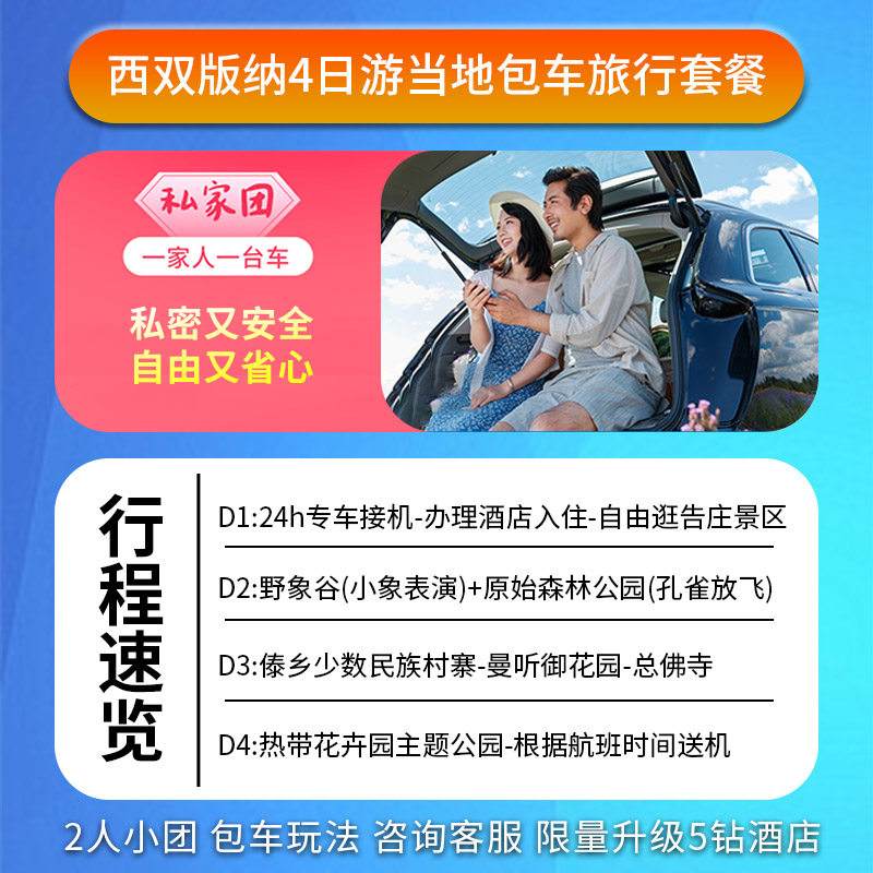 本线路支持1人独立预订,无需拼团等待,特别适合临时出差后顺道度假或独自出行的商务人士。4天3晚的行程安排紧凑而不仓促,既能高效完成差旅任务,又能沉浸式体验西双版纳的热带风情。私家团形式确保全程专属用车与导游服务,时间灵活调配,可根据航班或会议结束时间定制出发时段,真正实现“差旅+度假”无缝衔接。
