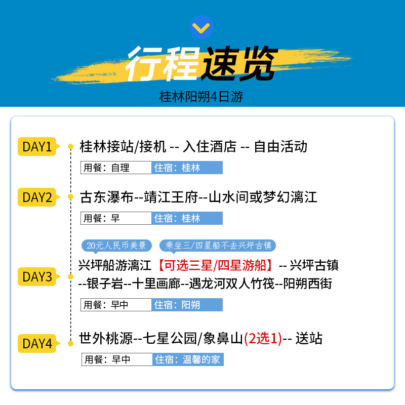 精心规划的4天3晚行程涵盖漓江、阳朔、象鼻山、古东瀑布、兴坪古镇等核心景点,路线环线设计,避免重复交通耗时。特别适合仅有周末或短假期的差旅人士,最大化利用有限时间,一次性打卡桂林最具代表性的自然与人文景观,高效且充实。