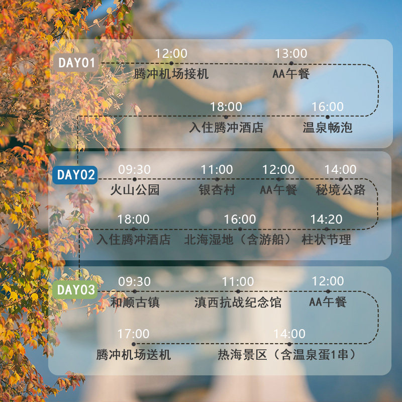 本产品起点与终点均为保山市,特别适合在当地有公务安排的差旅人士。无需额外奔波至其他城市集合,大幅减少交通耗时与费用。利用公务间隙直接开启度假模式,实现‘落地即游’的无缝衔接,最大化利用有限假期,提升差旅综合效益。