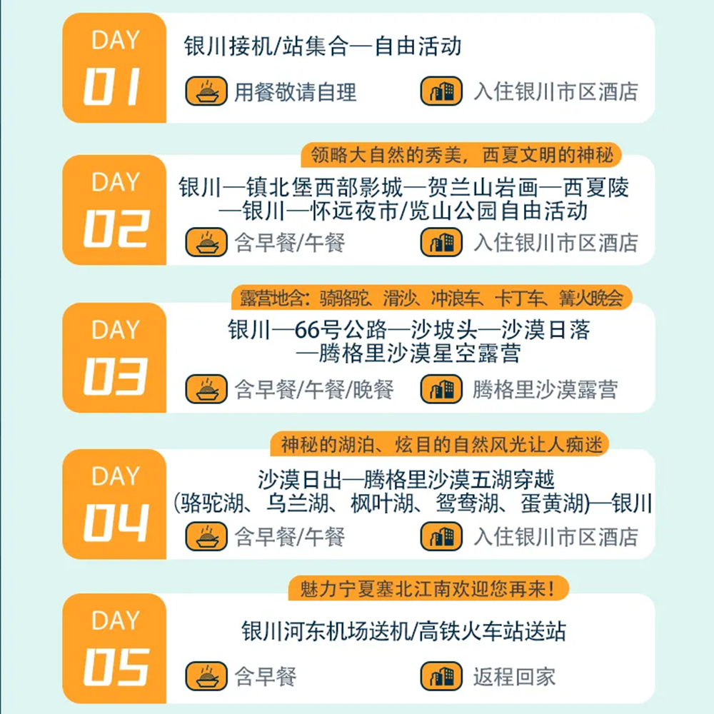 无论您身处北京、上海、广州、深圳等一线城市,还是成都、西安、杭州、武汉等新一线枢纽,均可便捷搭乘航班直达宁夏银川或中卫。本产品专为差旅人士设计,支持1人成行,无需拼团等待,灵活安排出发时间,让商务出行后的度假转换零负担。5天4晚行程紧凑而不仓促,助您在高效差旅之余,沉浸式体验腾格里沙漠五湖穿越的壮美与宁静。