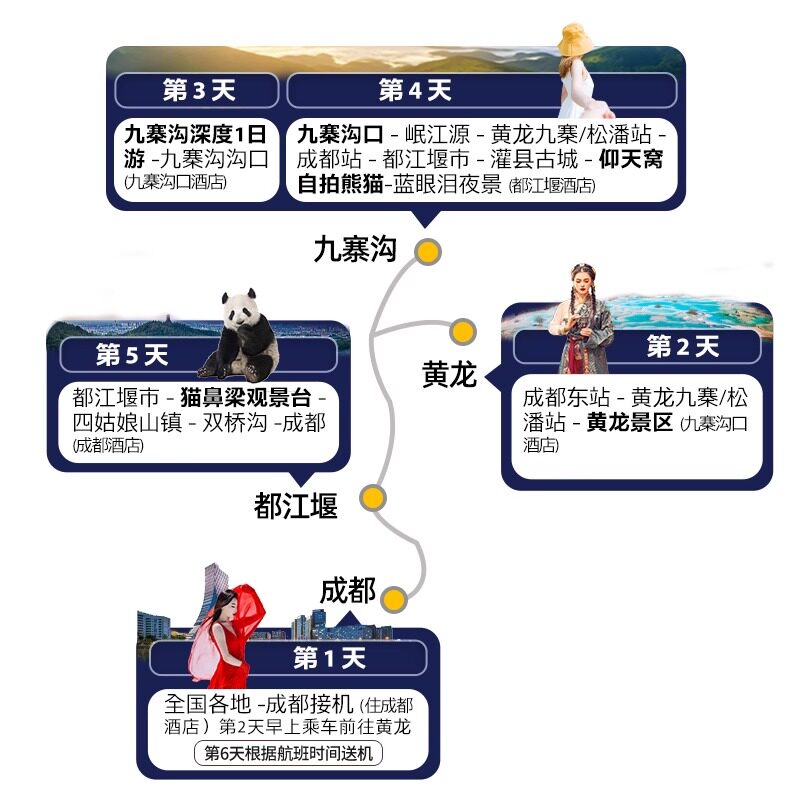 6天行程浓缩川西最精华资源:从成都都市文化到九寨沟自然奇观,从黄龙钙华池到三星堆文明遗址,形成‘自然+人文+萌宠+美食’的多维主题体验。特别适合时间有限但希望高效体验四川多元魅力的差旅人士,无需自行规划路线,专业团队已为您优化动线,最大化利用每一分钟假期。