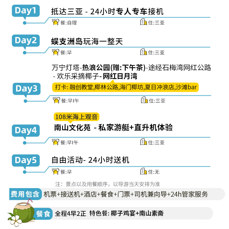 行程采用‘跟团+自由’结合模式,前几日安排蜈支洲岛、万宁灯塔等核心景点游览,确保高效打卡;后段预留充足自由活动时间,方便差旅人士根据会议结束时间灵活调整。无论是补觉休整、处理邮件,还是自行探索三亚湾日落、体验水上乐园,都能自主掌控节奏,真正实现工作与休闲的平衡,满足现代职场人对度假灵活性的高要求。